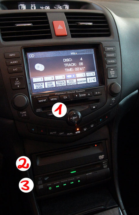 Hallo liebe Accord-Fahrer, auf die Gefahr hin dass dies der 900. Thread zum Thema AUX-Eingang ist, bitte ich um Nachsicht. Habe mir kürzlich einen 2003er Accord Tourer Executive (2.4) zugelegt und kenne die Ausstattungsvarianten nicht so. Dieser verfügt über einen ZUSÄTZLICHEN DVD-Player, der für mich irgendwie wie Original-Ausstattung aussieht (siehe Fotos). Auf dem Bild seht ihr oben das Radio (1) mit üblicher "CD-Futterstelle", darunter der DVD-Player (2) für die Navi-DVD und darunter NOCH ein DVD (und angeblich MP3) -Player (3) mit AUX-Eingang (!). Jedoch bekomme ich das Teil nirgends angesteuert. Man kann ihn zwar ein und ausschalten und mit CDs füttern, aber irgendwie kommuniziert er nicht mit dem System.... :-( Kennt jemand diese Anordnung mit den 3 Geräten? Wenn ja, wie steuert man das untere Gerät (Nr. 3) an? Vielen Dank! :-))))- 11 Antworten