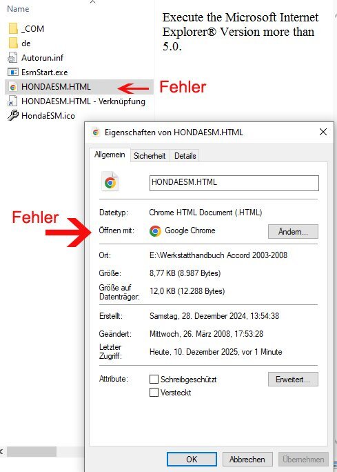 In der Einstellung bei Edge habe/haben wir auch das gleiche (Link), ABER wenn der Verweis von HONDAESM.HTML im Explorer nicht auf Edge (als Start) zeigt, sondern auf Chrom oder sonst was anderes, dann funktioniert das ganze mit dem Start nicht richtig...siehe bitte und vergleiche mein Bild. Fehler leicht zu korrigieren, unter "Eigenschaften von HONDAESM.HTML" "Öffnen mit:" Ändern...: -