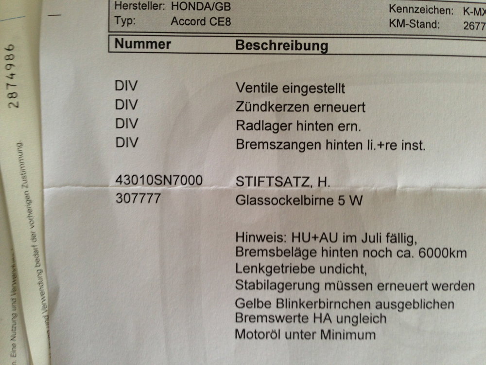 ...vielen Dank, Kardynau! Was wäre diese Forum bzw. mein Accord nur ohne Dich! Irgendwie muss ich meine Suche verbessern, weil ich die ganzen von Dir gelinkten Posts nicht gefunden hab! Morgen kommt nun erstmal der Lenkgetriebe-Wechsel und mein self-made Service folgt dann am Freitag, da ich heute noch die Unterlegscheiben und Curil T besorgt habe! :D Vielen Dank nochmal! Ich werde dann berichten wie es ausgegangen ist... Ps.: Mein Fahrzeug: SHHCE8560WU037009 -