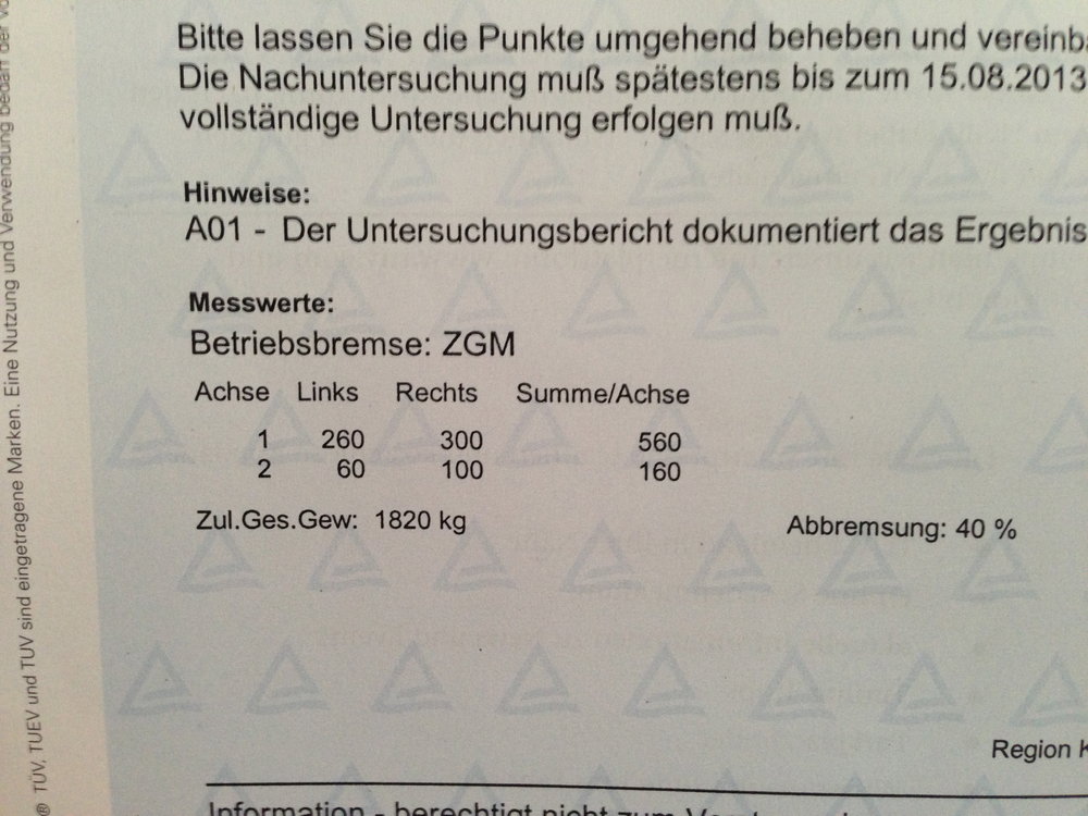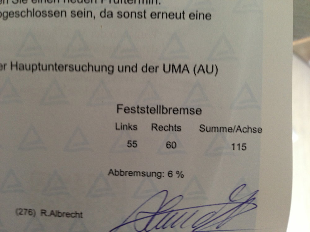 hi, also laut gutachter sei Feststellbremse nicht in Ordnung! Es geht wohl um die Abremsung in %. Ich habe 6% und es müssen wohl ca. 15% sein :( . Also brauchen wir "nur" den Bremskolbenrückstellschlüssel? Bei Honda ging es wohl um die Bremszangen hinten. Diese haben Sie mir wohl mit STUFSATZ.H 43010SN7000 wieder versucht instandzusetzen und das war am 20.06.! Sie haben mich auch darauf hingewiesen, dass die Bremswirkung hinten unterschiedlich sei, meinten aber, dass es für den Tüv wohl reichen sollte. Hätte man danach entlüften müssen? Oder hat die Sache mit meinem Problem nichts zu tun? Gruß -