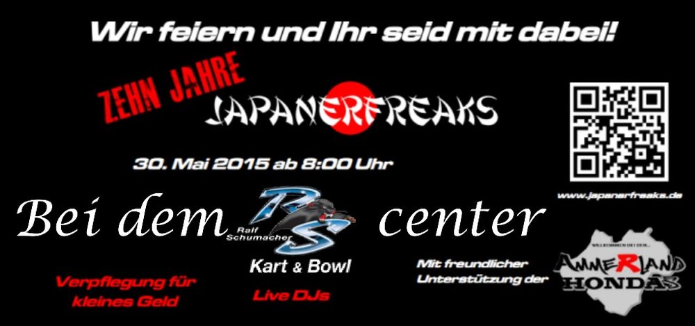 !!!Achtung Achtung !!! Ausgegeben Anlass mussten wir die Location wechseln, die RS Kartbahn in Bispingen hat uns freundlicherweise einen Teil von ihrem Gelände für unseren Event zu Verfügung gestellt. Adresse: Ralf Schumacher Kart & Bowl Schumacher's Motodrom GmbH Horstfeldweg 5 D-29646 Bispingen Bitte meldet euch für das Treffen an unter http://www.japanerfreaks.de/10_Jahre_JF.html