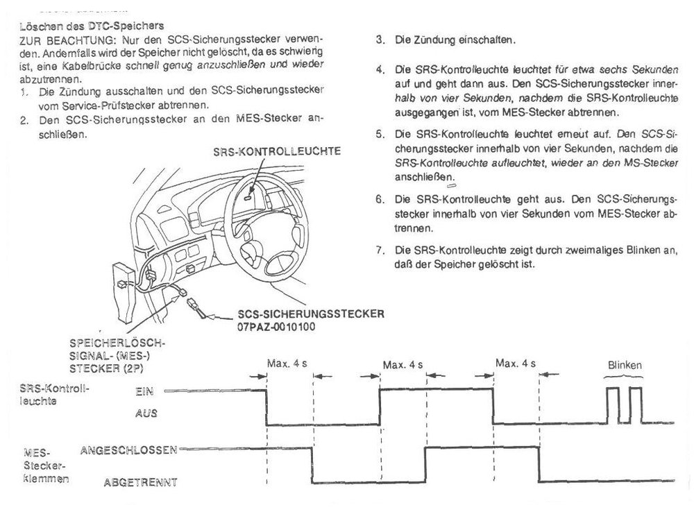 Hi an alle!!! Sorry das ich nicht gaschrieben hab, war in Urlaub (kein internet) Danke für die Tips, aber ich wollte auf nummer sicher gehen! Und bin heut zu Honda gefahren. Wiest ihr was die mir gesagt haben!!? Sowas können wir nicht machen, an Air Bag elektronik dürfen wir nichts machen!!! Das war der schock :schock: Dann hab ich den Meister gefragt ob er mir anschluß plan zeigen kann, und tatsächlich wie ich mir gedacht habe: zwei kabel, gleich farbig, beim aufpral kriegen beide strom, prinzip einer glühbirne. Dann war die nechste frage wie ich die SRS-leuchte auslöschen kann, dann hat er gement, wenn du es angeschlossen hast kommst du wieder wir tun das loschen, dann habe ich den gefragt ob man das mit baterie abklemmen machen kann,meinte er nien muß man mit auslesegerät machen. Dann war der hammer!! Ich habe zu dem gesagt wir machen es gleich, in zwei minuten ist der stecker angeschlossen und dann kannst du das auslesen, dazu meinte nur eins NIEN nicht auf unseren gelende!!! :wall: Naja nach lange rede hat er mir ein ausdruck gegeben wo alles beschrieben ist wie man die SRS-leuchte auslöschen tut, gut oder :D Habe zu hause alles gemacht, funkzioniert ohne wieteres und ohne auslesegerät 8) Naja hoffentlich exlodiert er nicht unterwegs :bombe: Habe den ausdruck hochgeladen, falls noch jemand das braucht!!! Mfg. Anton