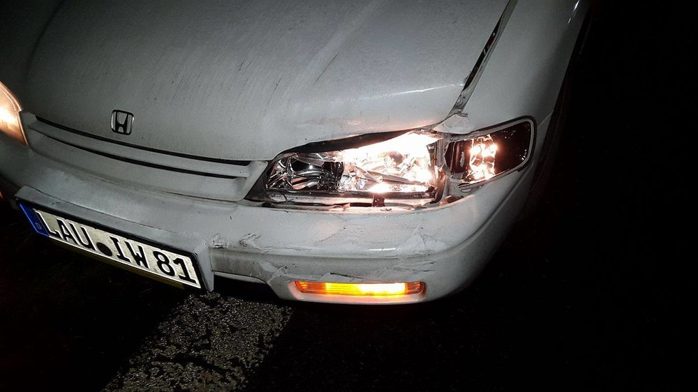 Motorhaube (könnte man auch wieder hinbiegen), Kotflügel, Scheinwerfer und Blinker