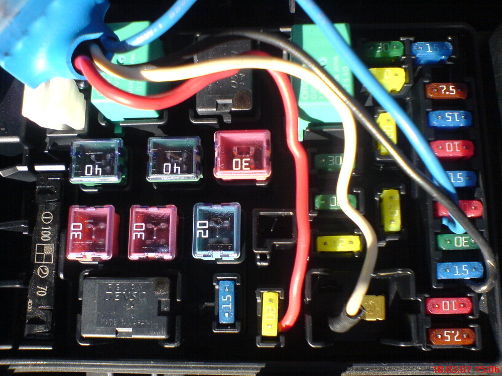 Die Einfachste Art siehst Du in pic1: - rot: dauerplus - weiß: Zündungsplus (Diesel!) - schwarz: Abblendlicht - blau: Fernlicht Die komplexere Art sieht man in den beiden anderen Bildern, sprich d.h. Einbau des Tagfahrlichtmodules unterhalb des Sicherungskastens, so daß es nachher nicht mehr sichtbar ist und nicht so provisorisch aussieht ;)
