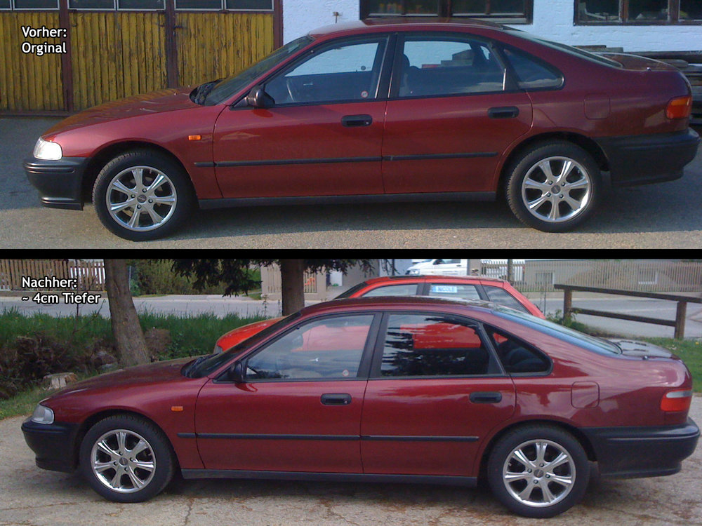 Was für ein Tag... Wir schreiben Samstag den 31.04.2001... Der Honda Fahrer "Lenz" will seinen CC7 tieferlegen... doch niemand wusste was da auf ihn zukam... ;) Jau, gestern war es soweit und mein geliebter Honda Accord CC7 BJ '94 ging vier Zentimeter in die Knie. Laut meinem Kollegen sollten 4 Stunden reichen... ich rechnete so mit 6-7 Stunden... doch es kam ganz anders. Morgens um 9 Uhr gings in die grosse Werkstatt meiner Schwiegereltern (in spe ^^). Dort angekommen, haben wir erstmal gemütlich das Werkzeug vorbereitet und noch eine Zigarette geraucht. Wir fingen mit der Hinterachse an. Lief alles ohne Probleme. Rechts Hinten dauerte ca. 1 1/2 Stunden, das linke dann nur noch ca eine 3/4 Stunde. Die hintere Achse war also mit rund 2 Stunden erledigt und wir lagen gut in der Zeit. Doch dann kam die Vorderachse... Ich habe von solchen Sachen ja absolut keine Ahnung und mein Kollege hat zwar schon mehrere Auto's tiefergelegt und besaß auch sonst einiges an Schrauber erfahrung, aber nen Honda Accord hatte er noch nicht tiefergelegt. Schon beim ersten Blick als das Rad abmontiert war, meinte mein Kollege nur... "Aaaahja..." Wenn er das sagt weiss ich das es nicht so leicht wird ^^ Nach einigen Überlegungen entschieden wir uns dafür, sowohl den Dämfper als auch den Querlenker abzuschrauben um dann den Dämpfer leichter herauszubekommen. Gesagt getan... mit etwas Druck auf die Achse lies sich der Dämpfer dann auch entfernen... Alte Feder runter, H&R Feder drauf... Dämpfer wieder reingesteckt und Achse wieder hochgezogen... denkste... die Achse wollte nicht mehr hoch... was war passiert? Wir haben die Achse zu Weit nach unten gedrückt und durch den abmontierten Querlenker scheinbar viiiiiiel zu weit... Antriebswelle rausgesprungen -.- :cry: X( :wall: ca 1 Stunde haben wir vergebens versucht die Welle wieder einzufädeln... uns blieb nichts anderes übrig, als die komplette linke Aufhängung zu demontieren... bis dann wieder alles inkl. Dämpfer und Rad dran war dauerte es ca. 5-6 Stunden... Auf der rechten Seite waren wir dann aber schlauer und brauchten nur noch 1 1/2 Stunden... Insgesamt haben wir also ca 12 Stunden gebraucht... dabei haben wir uns 3 Schürfwunden, 1 Plattgedrückten Daumen sowie schmerzen am ganzen Körper aufgrund komischer haltungen zugezogen... Wir haben 1 Fanta, 4 Cola, 3 Leberkäs semmeln und 2 Schachteln Zigaretten verbraucht... Das ergebniss kann sich aber sehen lassen... 4cm sind zwar nicht viel... aber es sieht auf alle fälle besser aus als vorher... Im Anhang noch einige Bilder, sowie ein Vergleichsbild, Vorher/Nacher :)