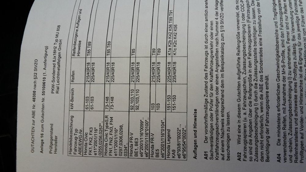 Biete hier 4 Sommerreifen 225/40ZR18 auf Felge an. Sie waren auf einen Honda Accord Tourer CN2 montiert. Es mußten keine Radläufe gezogen oder gebördelt werden an meinem Auto. Laut ABE passen sie auf viele Honda Accord Modelle,Honda CR-V, Honda Civic ,Honda FR-V und Honda Legend. Die Bezeichnung der Verschiedenen Honda Modelle findet ihr bei den Bildern Zu den Felgen: Es sind Felgen von Rial Typ Murano LK : 5/114,3 ET : 50 Die Felgen haben aufgrund ihres Alters schon ein paar Gebrauchsspuren. Das heißt, sie haben hier und da Kratzer.Einige sind vom lagern entstanden.Da wo sich die felgen berührt haben beim Transport.. . Sie sind nie im Winter gefahren worden und wurden immer gereinigt eingelagert. Ich habe versucht, die größeren Kratzer zu fotografieren. Eine Felge hat lt Reifenhändler einen leichten Höhenschlag. Daher wurde sie immer hinten gefahren.es wsr nicht merkbar. ABE und Radbolzen sind vorhanden Zu den Reifen: Es sind Dunlop RT2 in der Größe 225/40ZR18. Sie sind im Mai 2017 gekauft worden (Rechnung vorhanden) und sind dann ca 7 Monate gefahren worden.Profiltiefe kann aber auf Wunsch gemessen werden. Der neupreis der Reifen lag bei 476 Euro. Möchte noch ca 300 Euro für alles zusammen haben. Sie stehen im Ruhrgebiet in Marl (45770)