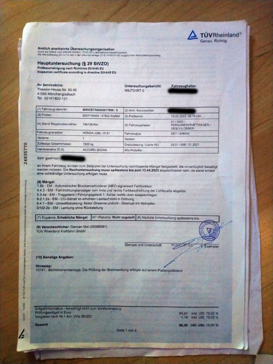 Hallo zusammen, ich verkaufe einen Honda Accord (CE7) als Limousine. Das Fahrzeug ist seit 11 Jahren mein treuer und solider Begleiter, doch nun gebe ich ihn gern in gute Hände ab. Reparaturen wurden bei Fälligkeit durchgeführt. Daten zum Fahrzeug: Honda Accord 1.8i (CE7) Limousine • Farbe Blue Metallic • Vorbesitzer 1 • Erstzulassung 1/1998 • Motor 4 Zylinder 1.8 Liter 85 kW / Benzin • Kilometerstand 187.000 km, kann aber noch abweichen,da das Fahrzeug täglich bewegt wird • TÜV/AU 01.2023 • Nichtraucher Fahrzeug Ausstattung: • Honda-Alufelgen mit Sommerbereifung 205 / Winterreifen auf Stahlfelgen 185 • 5 Gang • Volllederausstattung Beige / Vorne immer mit Schonbezügen. • Klima / Radio mit Kassette. • Schiebedach elektrisch • Fensterheber 4 mal elektrisch • Rückbank geteilt und umlegbar • Sitzheizung für Fahrer- und Beifahrer • ABS, Servo, Airbags, Zentralverriegelung, 3 Schlüssel Besonderheiten: Das Fahrzeug war bei den Dreharbeiten der Serie "Wir sind die Welle" am Start. Reparaturen: Immer bei Bedarf. bekannte vorhandene Mängel:Fensterscheibe Fahrer klemmt, Kofferraumschloss (nur vom Fahrersitz...) Neuer Fahrerspiegel (grün) Klima muss neu befüllt werden.....Türschloss hakelt. Elektrischer Türoffner hakelt. Aus derScheibenwaschanlage kommt nach einer Autowäsche nix mehr raus. Siehe TÜV Bericht bei den Bildern Der Accord ist derzeit noch zugelassen und kann nach Absprache besichtigt und Probe gefahren werden. Standort Krefeld. Das Fahrzeug wird privat und unter Ausschluss der Gewährleistung verkauft. Nur hier im Forum. Zeitlich befristet. VB 750 Euro Alle Angaben wurden nach bestem Wissen und Gewissen gemacht....Ich hoffe das ich alle Regeln des Forums beachtet habe. Weitere Bilder liegen vor. Würde mich freuen von Euch zu hören. Auch wenn nur Einzelteile eine weitere Verwendung finden. (FZ wird nur komplett abgegeben) Gruß houbi