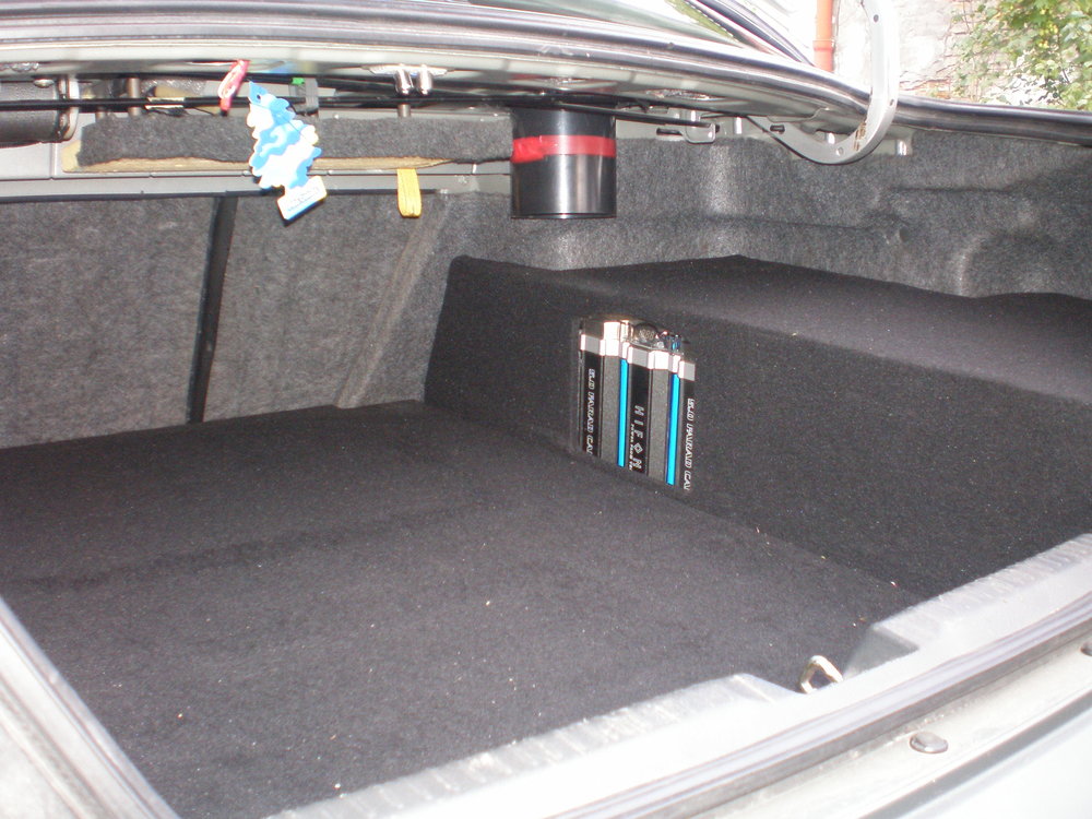 im Kofferraum mit elektronischem Batterietrennrelais, Rückfahrkamera und Hifonics 5 Farrad Powercap.