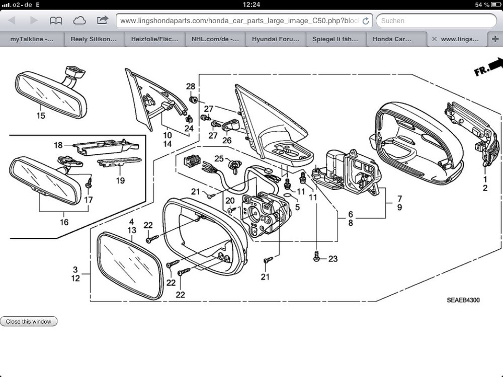 Zerlegen ist kein Hexenwerk aber ob dich das weiterbringt ist die Frage. Ersatzteile für'n Spiegel sind dann aber unerschwinglich :roll: Könnte mir vorstellen daß sich die Nummer 7/9 verabschiedet hat und die kostet mal eben 180€ :schock: Wenns die Spiegelkappe überlebt hat sich dir einen Ersatz und Wechsel die Kappe einfach aus. http://http://www.lingshondaparts.com/honda_car_parts_large_image_C50.php?block_01=17SEA701&block_02=B__4300&block_03=3197- 13 Antworten
