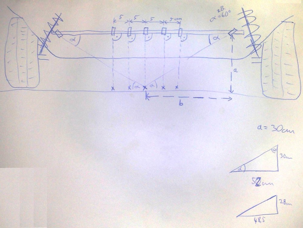 16. warum qualm? man sieht am boden die jeweiligen 5 laserpunkte, das sollen die bezugsounkte sein, und die 2 laser links und rechts leuchten im ruhezustand auf den mittleren der 5 punkte aufm boden. wird hier nun das heck belastet wandern die 2 messlaserpunkte am boden links und rechts auseinander. wenn ich weiss dass ich bei 30kg die ich ins heck packe die messpunkte um zB 10cm auseinanderwandern kann man alles andere ausrechnen. mir gehts nicht um aufs gramm genau messen zu können, aber um zu sehen ob man 10 oder 50kg abtrieb hat sollte weit aus mehr als reichen. ich vermute mal so dass die genauigkeit um +/- 10kg locker machbar sein sollte, wenn ma alles ordentlich aufbaut. sinn von ungeeichten messverfahren? gibts genügend. um tendezen zu erkennen, um mit wenig geld auch "gute" -nicht sehr gute- ergebinsse zu bekommen.