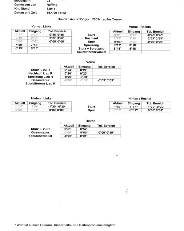 Hallo Habe das Messprotokoll leider nicht mehr. Meiner Erinnerung nach ist von Honda die Spur vorne mit + "X°" bis 0° angegeben. Sie wurde aber trotzdem so 0.1° bis 0,2° in`s Minus gestellt. Das verursacht, dass die Reifen hinten irgendwie anders nachlaufen müssen und das ganze weg radiert wird. Das Auto fuhr früher auch jeder Bodenwelle nach und musste ständig korrigiert werden. Was jetzt auch nicht mehr der Fall ist. Ich muss noch einmal erwähnen dass mein Sturz vor allem hinten rechts außer Toleranz ist. -